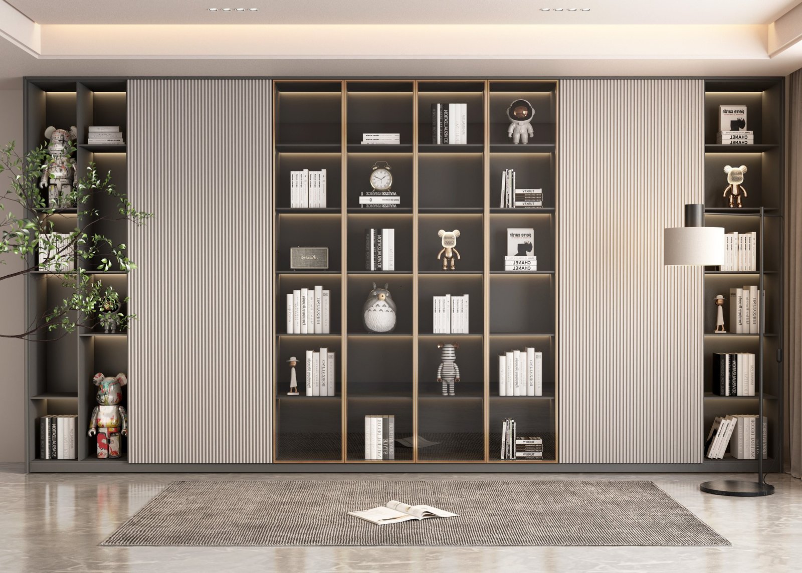 A space-saving floor-to-ceiling bookshelf with modular shelves accommodates large book collections. Solid wood frames and anti-tip brackets ensure stability. Customizable glass doors or LED lighting options add elegance while protecting books from dust, perfect for home libraries, living rooms, or educational institutions.